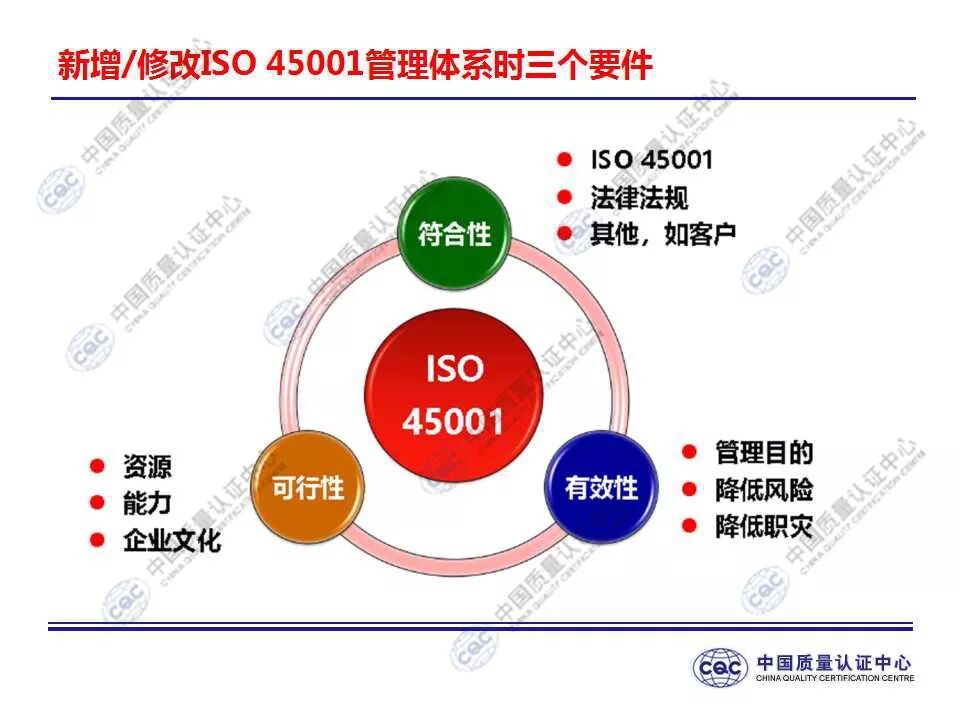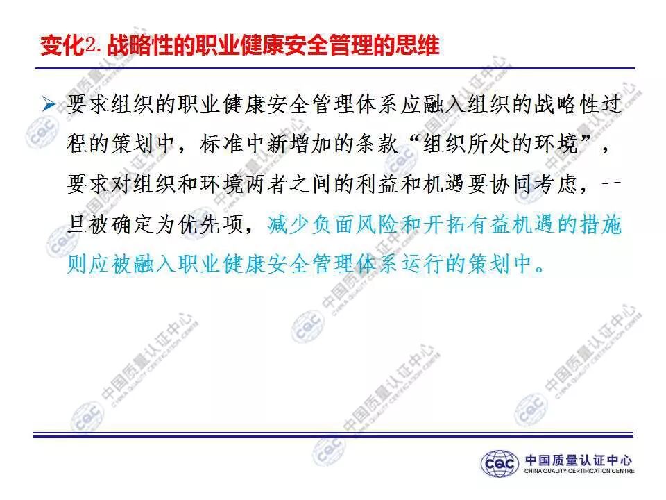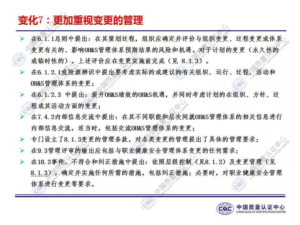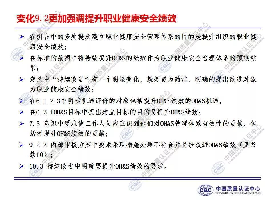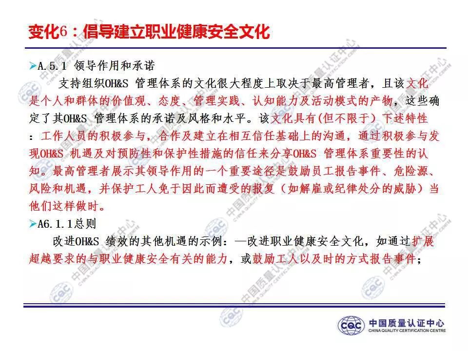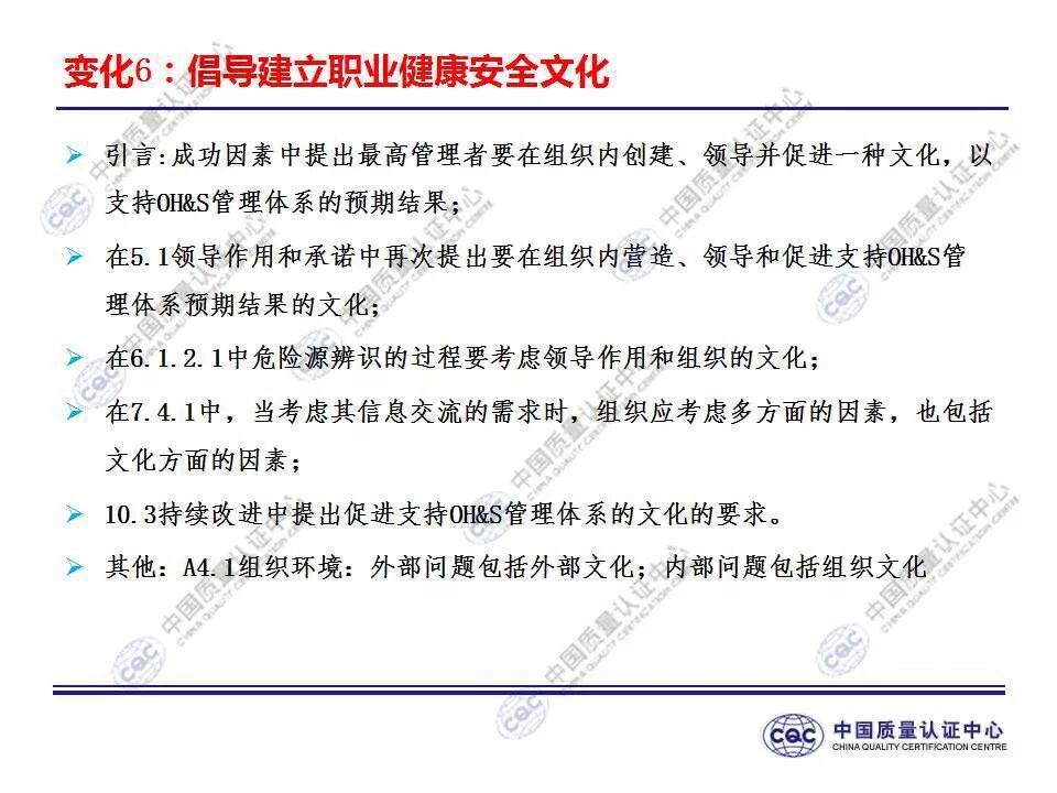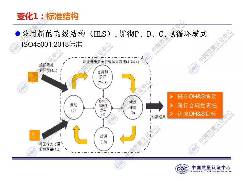 国家标准《职业健康安全管理体系 要求及使用指南》由424-cnis(中国标准化研究院)归口上报及执行,主管部门为国家市场监督管理总局。 新版标准的主要变化 GB/T 45001-2020与GB/T 28001-2011和GB/T 28002-2011相比,主要变化如下: 采用了ISO/IEC导则中的高阶结构; 采用了基于风险的思维; 更加强调组织环境以及工作人员和其他相关方的需求和期望; 强化了领导的作用; 强调了工作人员协商和参与; 细化了危险源辨识和风险评价的要求; 对成文信息的要求更加灵活; 细化了运行控制要求; 增加了采购控制、承包方控制、外包控制要求; 增加变更管理要求; 更加关注OH&S绩效、绩效监视和测量; 其他变化(如:术语、定义等)。 这些观点代表了健康和安全管理方式的重大转变。OH&S不再被视为“独立”,而是必须从管理健全和可持续组织的角度来看待。这就是说,虽然两种标准的方法不同,但根据OHSAS 18001建立的管理体系将成为移转到ISO 45001的坚实平台。 ▲ GB/T 45001-2020与GB/T 28001-2011的对应关系 ▲ GB/T 45001-2020新版标准的运行模式 在新标准中,一个组织将不仅仅专注于其直接的健康和安全问题,而是会考虑到更大的社会期许。组织需要考虑到他们的分包商和供应商,还有比如说他们自身的工作会在周围对相邻的邻居造成怎样的影响。这会比仅仅关注与内部员工的条件更加广泛,意味着组织不能仅仅将其风险通过外包“嫁接”出去。 GB/T 45001-2020强调,这些职业健康和安全因素体现在组织的整个管理体系中,需要从管理和领导层获得更高程度的认可。这对于那些目前习惯于将责任授权给一个安全经理而不是完全地融合入组织的运行中的使用者来说,将是一个很大的变化。GB/T 45001-2020要求职业健康和安全因素是组织完整管理体系中不可分割的一部分,而不再只是附加的部分。 标准要求组织在策划职业健康安全体系时,应确定组织所需要应对的风险和机遇。风险和机遇存在于组织的危险源、合规性,以及所处的环境和相关方需求和期望中。标准要求组织要采取应对风险和机遇的措施,以确保体系能够实现组织的预期结果,实现组织在职业健康安全方面的持续改进。 以下两份材料请参考!