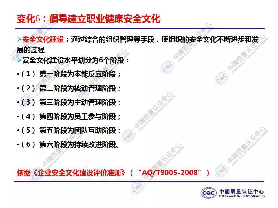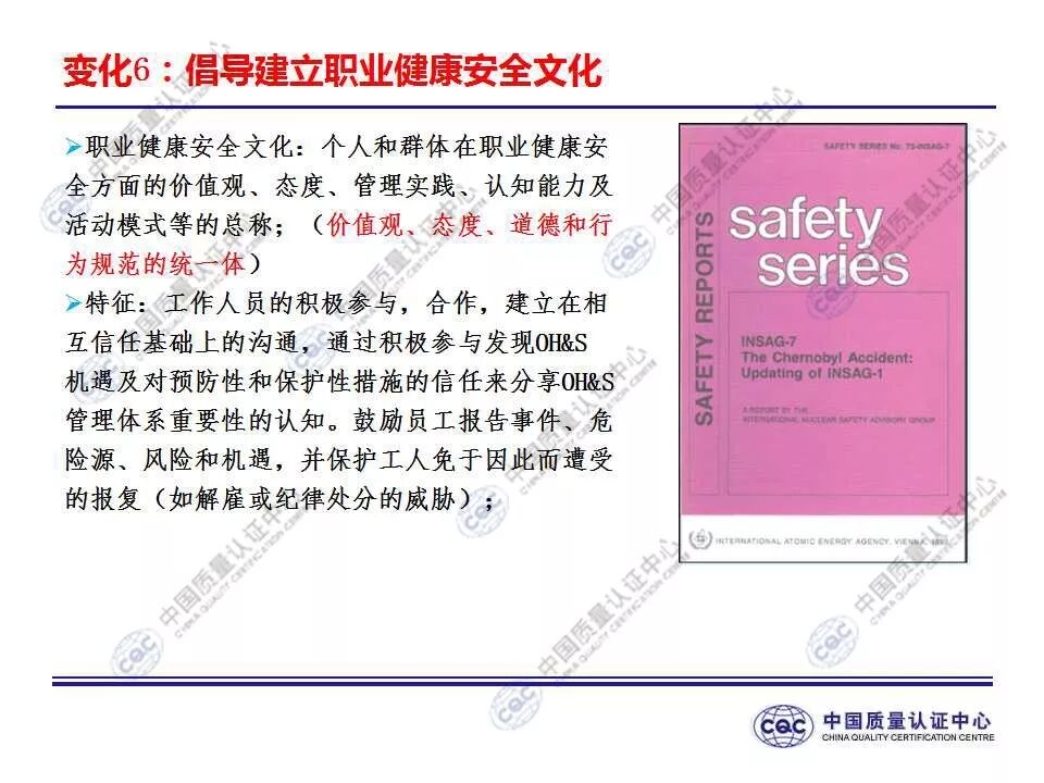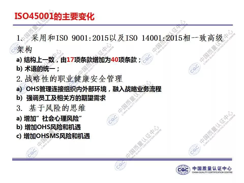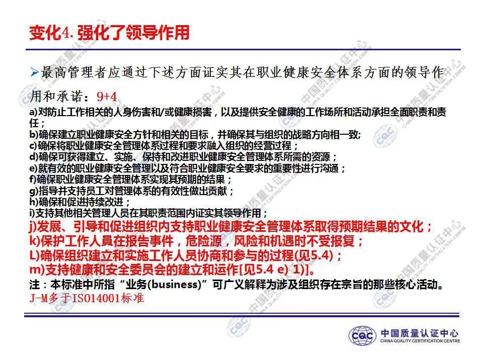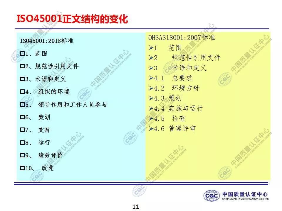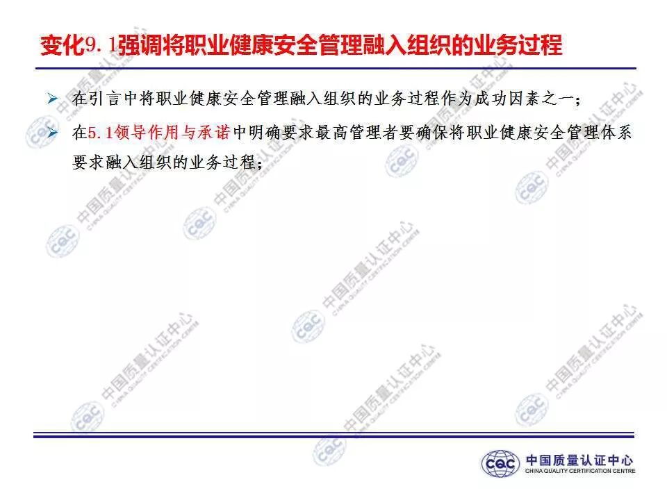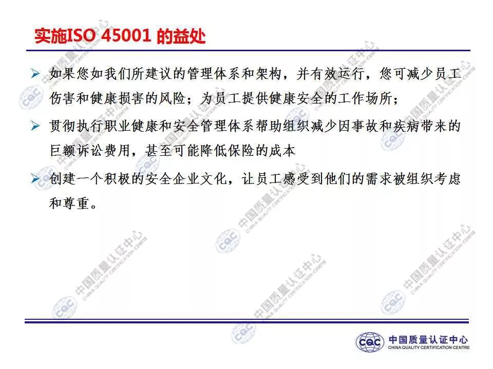 国家标准《职业健康安全管理体系 要求及使用指南》由424-cnis(中国标准化研究院)归口上报及执行,主管部门为国家市场监督管理总局。 新版标准的主要变化 GB/T 45001-2020与GB/T 28001-2011和GB/T 28002-2011相比,主要变化如下: 采用了ISO/IEC导则中的高阶结构; 采用了基于风险的思维; 更加强调组织环境以及工作人员和其他相关方的需求和期望; 强化了领导的作用; 强调了工作人员协商和参与; 细化了危险源辨识和风险评价的要求; 对成文信息的要求更加灵活; 细化了运行控制要求; 增加了采购控制、承包方控制、外包控制要求; 增加变更管理要求; 更加关注OH&S绩效、绩效监视和测量; 其他变化(如:术语、定义等)。 这些观点代表了健康和安全管理方式的重大转变。OH&S不再被视为“独立”,而是必须从管理健全和可持续组织的角度来看待。这就是说,虽然两种标准的方法不同,但根据OHSAS 18001建立的管理体系将成为移转到ISO 45001的坚实平台。 ▲ GB/T 45001-2020与GB/T 28001-2011的对应关系 ▲ GB/T 45001-2020新版标准的运行模式 在新标准中,一个组织将不仅仅专注于其直接的健康和安全问题,而是会考虑到更大的社会期许。组织需要考虑到他们的分包商和供应商,还有比如说他们自身的工作会在周围对相邻的邻居造成怎样的影响。这会比仅仅关注与内部员工的条件更加广泛,意味着组织不能仅仅将其风险通过外包“嫁接”出去。 GB/T 45001-2020强调,这些职业健康和安全因素体现在组织的整个管理体系中,需要从管理和领导层获得更高程度的认可。这对于那些目前习惯于将责任授权给一个安全经理而不是完全地融合入组织的运行中的使用者来说,将是一个很大的变化。GB/T 45001-2020要求职业健康和安全因素是组织完整管理体系中不可分割的一部分,而不再只是附加的部分。 标准要求组织在策划职业健康安全体系时,应确定组织所需要应对的风险和机遇。风险和机遇存在于组织的危险源、合规性,以及所处的环境和相关方需求和期望中。标准要求组织要采取应对风险和机遇的措施,以确保体系能够实现组织的预期结果,实现组织在职业健康安全方面的持续改进。 以下两份材料请参考!