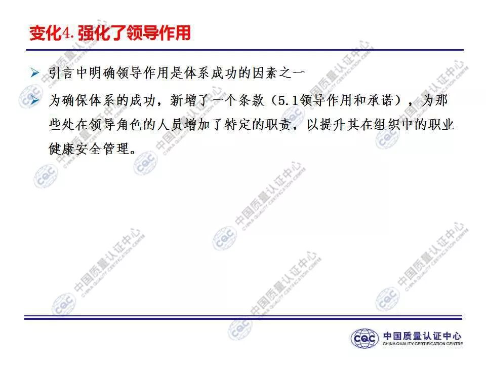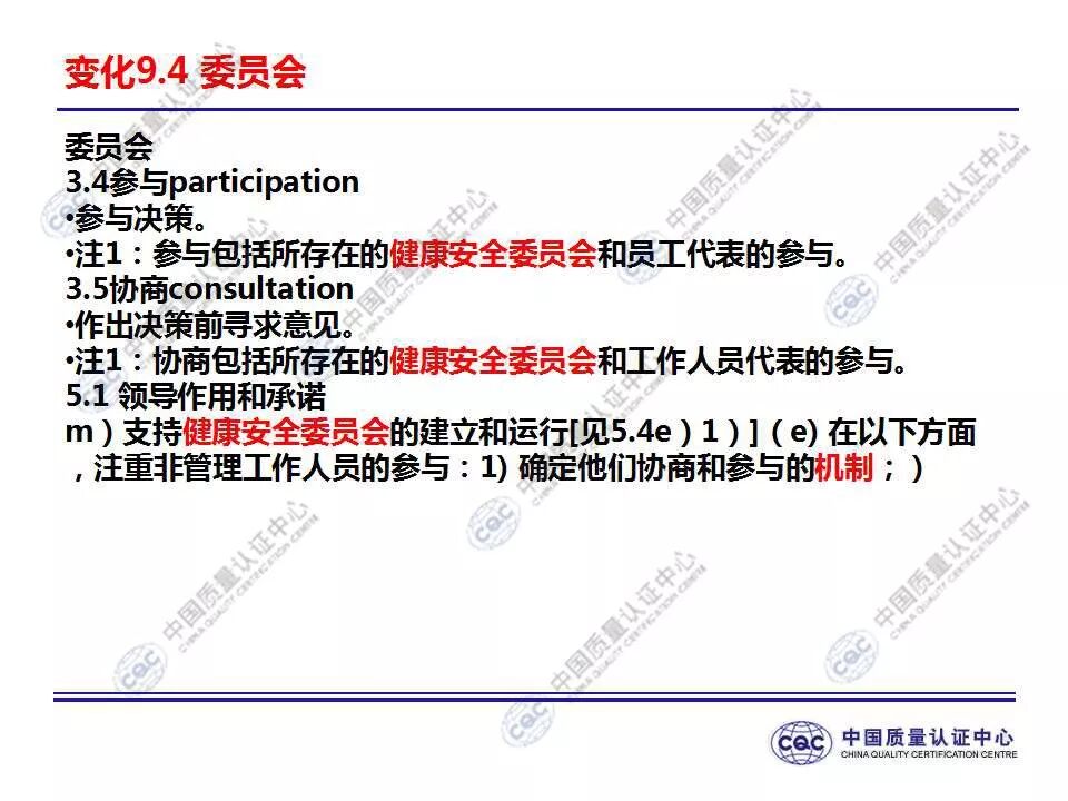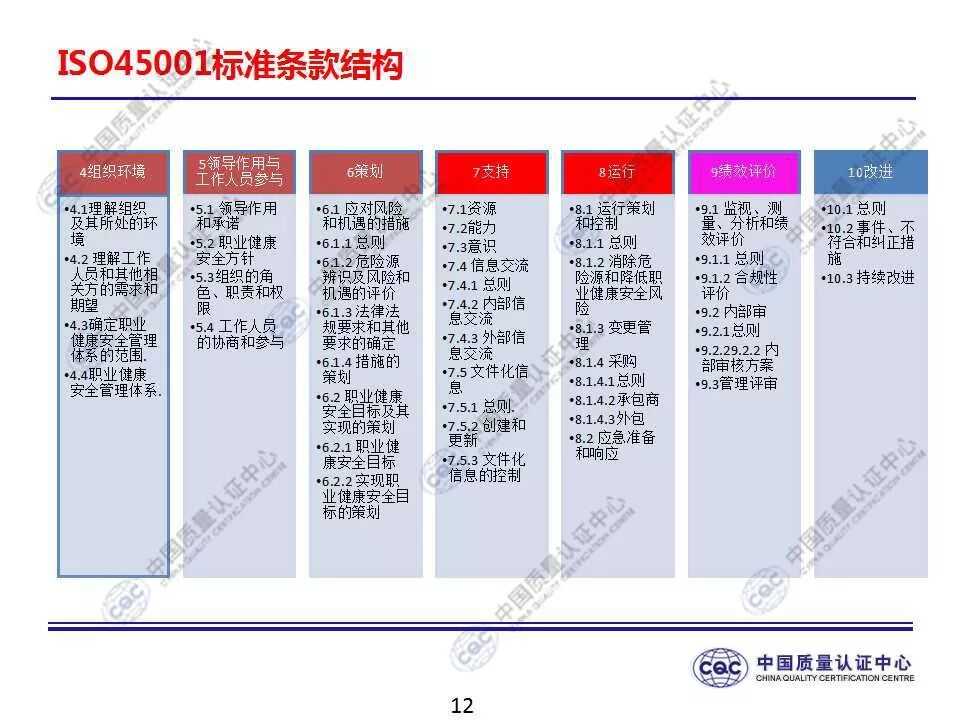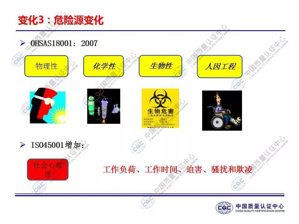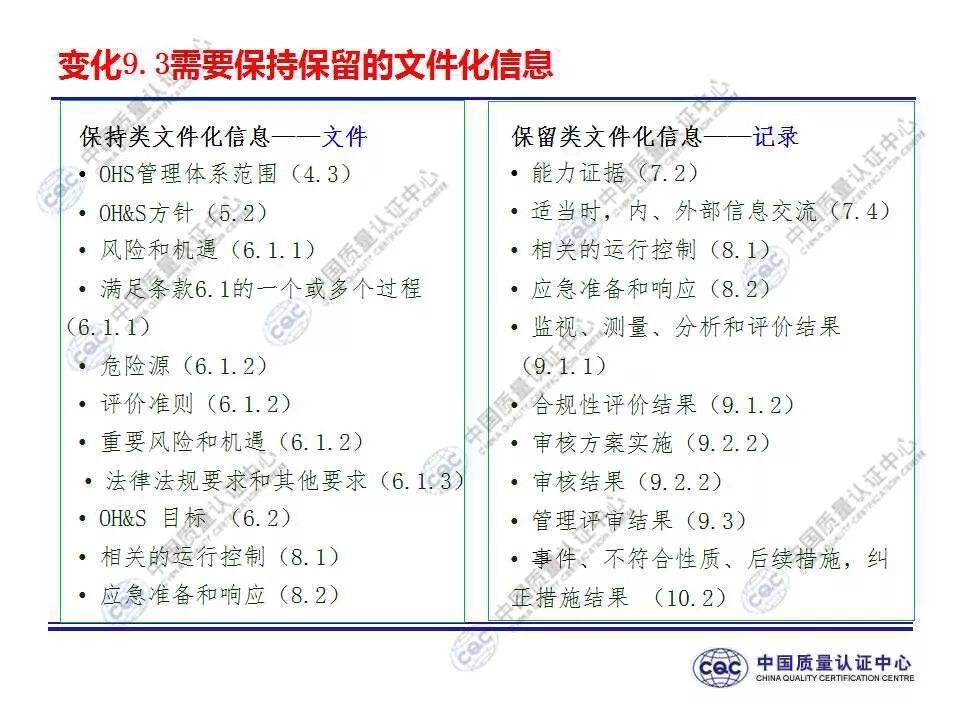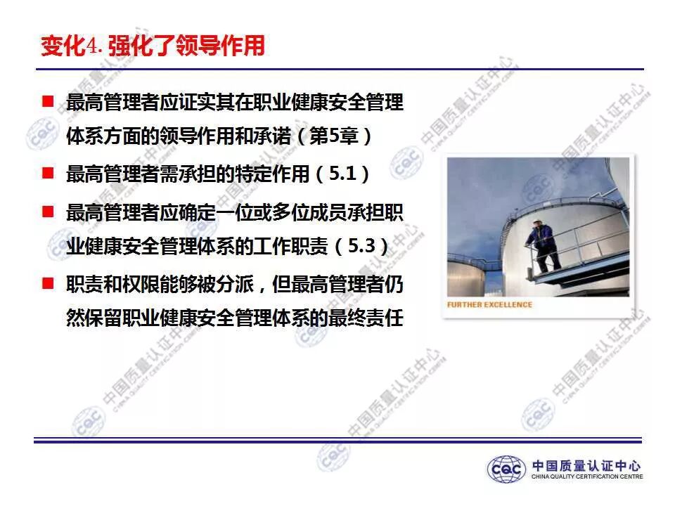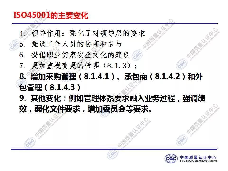 国家标准《职业健康安全管理体系 要求及使用指南》由424-cnis(中国标准化研究院)归口上报及执行,主管部门为国家市场监督管理总局。 新版标准的主要变化 GB/T 45001-2020与GB/T 28001-2011和GB/T 28002-2011相比,主要变化如下: 采用了ISO/IEC导则中的高阶结构; 采用了基于风险的思维; 更加强调组织环境以及工作人员和其他相关方的需求和期望; 强化了领导的作用; 强调了工作人员协商和参与; 细化了危险源辨识和风险评价的要求; 对成文信息的要求更加灵活; 细化了运行控制要求; 增加了采购控制、承包方控制、外包控制要求; 增加变更管理要求; 更加关注OH&S绩效、绩效监视和测量; 其他变化(如:术语、定义等)。 这些观点代表了健康和安全管理方式的重大转变。OH&S不再被视为“独立”,而是必须从管理健全和可持续组织的角度来看待。这就是说,虽然两种标准的方法不同,但根据OHSAS 18001建立的管理体系将成为移转到ISO 45001的坚实平台。 ▲ GB/T 45001-2020与GB/T 28001-2011的对应关系 ▲ GB/T 45001-2020新版标准的运行模式 在新标准中,一个组织将不仅仅专注于其直接的健康和安全问题,而是会考虑到更大的社会期许。组织需要考虑到他们的分包商和供应商,还有比如说他们自身的工作会在周围对相邻的邻居造成怎样的影响。这会比仅仅关注与内部员工的条件更加广泛,意味着组织不能仅仅将其风险通过外包“嫁接”出去。 GB/T 45001-2020强调,这些职业健康和安全因素体现在组织的整个管理体系中,需要从管理和领导层获得更高程度的认可。这对于那些目前习惯于将责任授权给一个安全经理而不是完全地融合入组织的运行中的使用者来说,将是一个很大的变化。GB/T 45001-2020要求职业健康和安全因素是组织完整管理体系中不可分割的一部分,而不再只是附加的部分。 标准要求组织在策划职业健康安全体系时,应确定组织所需要应对的风险和机遇。风险和机遇存在于组织的危险源、合规性,以及所处的环境和相关方需求和期望中。标准要求组织要采取应对风险和机遇的措施,以确保体系能够实现组织的预期结果,实现组织在职业健康安全方面的持续改进。 以下两份材料请参考!