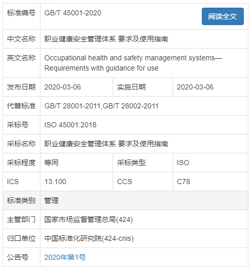 重磅!GB/T 45001-2020《职业健康安全管理体系 要求及使用指南》正式发布实施!