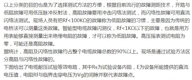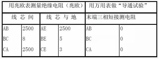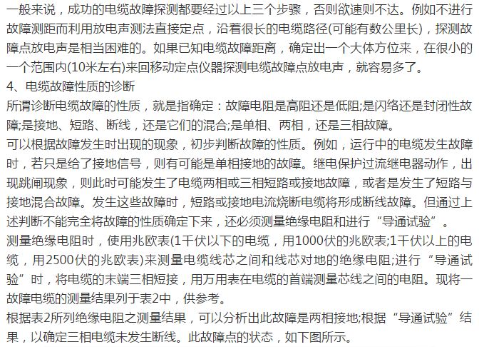 由于兆欧表分辨率比较差,当指示为零时,不能以为故障电阻就是零欧姆,要用万用表测量故障电阻的精确值,以确定故障是否是属于低阻的。可通过耐压试验确定高阻与闪络性故障,弄清故障点的击穿电压。