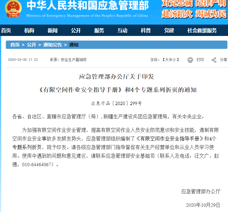 为加强有限空间作业安全管理,提高有限空间作业人员安全防范意识和安全技能,遏制有限空间作业安全事故多发频发势头,应急管理部组织编制了《有限空间作业安全指导手册》和4个专题系列折页,现予印发。请各级应急管理部门指导督促有关生产经营单位和从业人员学习使用。使用中遇到的问题和意见建议,请联系应急管理部安全基础司(联系人及电话:汪文广、赵德,010-64464067)。