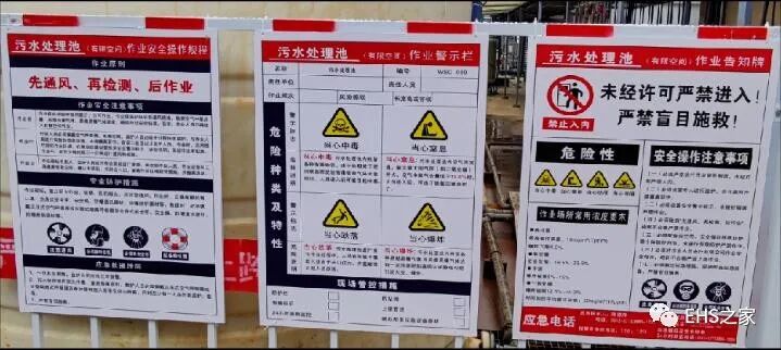 牌——警示牌。污水池入口处、楼梯处各设置三块尺寸统一的警示牌(告知牌、警示栏、操作规程);污水池栏杆处每个方向至少设置一块警示牌。