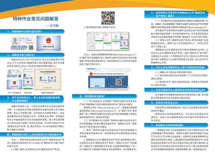 (二)对于新版证书。可使用“特种作业操作证及安全生产知识和管理能力考核合格信息查询平台”或微信公众号(国家安全生产考试)查验证书真伪。