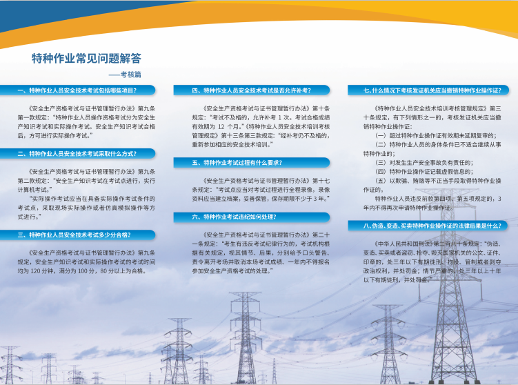 一、特种作业人员安全技术培训有哪些基本要求? 《特种作业人员安全技术培训考核管理规定》第九条规定:“特种作业人员应当接受与其所从事的特种作业相应的安全技术理论培训和实际操作培训。” 二、特种作业人员依据什么内容培训? 三、特种作业人员培训对学时有什么要求? 四、特种作业操作证多久复审一次? 五、特种作业操作证什么情况下可以延长复审时间? 《特种作业人员安全技术培训考核管理规定》第二十一条规定:“特种作业人员在特种作业操作证有效期内,连续从事本工种10年以上,严格遵守有关安全生产法律法规的,经原考核发证机关或者从业所在地考核发证机关同意,特种作业操作证的复审时间可以延长至每6年1次。” 六、特种作业操作证复审有哪些要求? 七、特种作业人员可以领取职业技能提升行动补贴吗? 根据《国务院办公厅关于印发职业技能提升行动方案(2019—2021年)的通知》(国办发〔2019〕24号),应急管理部 人力资源社会保障部 教育部 财政部 国家煤矿安监局联合印发了《关于高危行业领域安全技能提升行动计划的实施意见》(应急〔2019〕107号),目前各省(区、市)和新疆生产建设兵团均印发了高危行业领域安全技能提升行动计划实施方案,对于参加培训后取得特种作业操作证书的人员,将按规定给予职业培训补贴。 根据国办发〔2019〕24号,职业技能提升行动补贴标准由各地根据实际确定,参加培训后取得特种作业操作证书的人员可以咨询当地应急管理部门或人力资源社会保障部门了解详细情况。 03 考核篇 一、特种作业人员安全技术考试包括哪些项目? 二、特种作业人员安全技术考试采取什么方式? 三、特种作业人员安全技术考试多少分合格? 四、特种作业人员安全技术考试是否允许补考? 五、特种作业考试过程有什么要求? 六、特种作业考试违纪如何处理? 七、什么情况下考核发证机关应当撤销特种作业操作证? 八、伪造、变造、买卖特种作业操作证的法律后果是什么?
