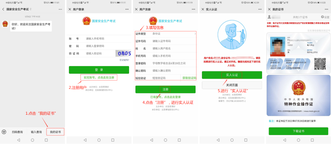 方法一:使用手机关注官方微信公众号(国家安全生产考试),按要求注册并进行实人认证后,在“我的证书”功能下载打印电子证书。