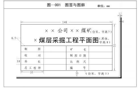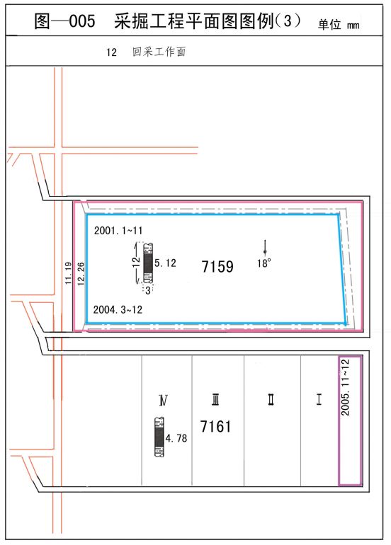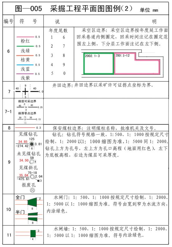 第1条 计算机绘制矿图必须做到准确、齐全、及时,符号运用要正确、统一,图纸内容应布置适当,着色准确;矿图必须依据《煤矿安全规程》、《煤矿防治水规定》、《煤矿测量规程》及通、防、机电提运、测量规范等法律、法规、条例和规定要求制作的基本矿图。 第2条 矿图上的内容、标注、符号、图幅及编号要符合规定技术标准,比例尺应符合规定。图纸中的采、掘巷道、工作面、安全生产的设备、设施等必须是实测资料,并能真实、现时的反映矿井生产及安全状况。各种注记必须齐全、规范。图纸中必须有图框线、图名、比例、图签、图例;图签栏内容应齐全,必须有煤矿法人或矿长及主要技术负责人的亲笔签字,并加盖本单位公章。 第3条 矿图要根据实际变化及时填绘和标注。 第4条 各种矿图均须使用统一的坐标系统。 第5条 计算机绘图人员要具有一定专业知识,掌握相关技术标准,采掘绘图员具有一定的矿井地质、水文、测量、采掘和储量的知识,通防和机电绘图员应有一定的本专业的知识。 第6条 图纸资料来源明确,图号清晰,编制、审核、校对分工明确。 第7条 绘制各类矿图时,必须由专业技术人员参与,正确使用图例,图纸精度要符合测量要求,保证矿图的质量。 第8条 各种矿图的绘制符合准确、及时、完整、美观的原则。达到线条均匀、圆滑,接头间无疙瘩,点线、虚线间隔大小一致,平行线间距相等,各种文字、数字注记规范,字隔、字向符合要求,颜色标准、着色均匀、内容齐全、完整、几何关系正确。 第9条 图纸要按规定定期填绘:采掘工程平面图由生产科每月3日前根据测量结果、地质情况绘制;矿井充水性图、月度预报图、月度计划图根据采掘工程平面图每月补充、修改、填绘一次;矿井涌水量与各种相关因素动态曲线图每月绘制一次;井上下对照图每季填绘一次;其他图纸每半年根据生产情况修正完善一次;应急图纸要随时填绘。 第1章 基本要求 第 1条.绘制采掘工程平面图的内容、精度以及绘制方法是依据《煤矿测量规程》、《煤矿地质测量图例》、《地形图图式》的要求,结合公司的具体情况制定的。 第 2条.绘制图种和比例尺,采掘工程平面图 比例尺1:2000 第 3条 绘制内容 1、井田技术边界,保安煤柱及其它边界线,注明名称及批准文号; 2、本煤层以及与开采本煤层有关的巷道(主要巷道应注明名称和月末工作面位置,斜巷应注明倾向和倾角,巷道交叉口、变坡以及平行等特征点,在图上每隔50~100mm应注记底板高程); 3、回采工作面及采空区。注记工作面月末位置,平均采厚、煤层倾角、开采方法、开采年度和煤层小柱状,丢煤区应注明丢煤区原因和煤量;注销区应注明批准文号和煤量; 4、永久导线点和水准点,注明点号和高程;临时点根据需要注记; 5、钻孔、勘探线、煤层露头线、风化带、煤层变薄区、尖灭区、陷落柱和火成岩侵入区、煤厚点、煤样点以及实测的主要地质构造; 6、发火区、积水区、煤及瓦斯突出区、冒流砂区等。应注明发生时间等有关数据; 7、井田边界外100m以内的临矿采掘工程和地质情况,井田范围内的小煤窑及其开采等有关情况; 8、煤层底板等高线、根据图面允许情况和实际要求,加绘地面重要工业建筑、居民区、铁路、重要公路、大的河流、湖泊; 9、水闸墙、水闸门、永久风门、防火门、突水点、抽放水钻孔,标注近期巷道、工作面探放水钻孔数量。 第4条 图种编绘原则及精度要求 1:2000采掘工程平面图的井巷部分按实际比例绘制,1:2000采掘工程平面图图例符号按相同比例尺的要求绘制。 重要地物与地物轮廓相对附近控制点的平面位置误差 次要地物、地物轮廓 井巷轮廓与最近控制点的相对位置误差 第5条.图面整饰 1.采掘工程平面图按上北下南方向绘制。 2.矿图一律采用100 mm×100 mm的坐标格网,格网线粗0.10mm。 3.图廓形式:最外为1.0mm粗的黑线,中间隔1.5mm画一条0.15mm粗的黑线,再隔15.0mm宽画0.15mm粗的黑线作为内图廓线。图签与图廓的绘制见图—001。 4.不是上北下南的正格分幅图和自由分幅图应绘制指北针,指北针绘制在图幅的右上角(原则绘制在第2×2格网处)。 指北针的绘制原则按图—003的要求绘制。 第6条.颜色规定 1.涉及井下测量控制点、边界、地层、岩石、地质勘探、地质构造等图例符号的颜色,以及测量、地质、水文地质、储量估算等图纸的颜色着色,原则按照图—004规定的颜色着色,未规定颜色均为黑色。 2.图中井田范围内的井筒和钻孔的地面高程一律用红色注记,工业广场及风井煤柱用红色线条。 3.井巷工程中,岩巷用桔黄色;分煤层绘制的,煤巷用黑色,综合绘制的,主采煤层用黑色,其它煤层开采的巷道用墨绿色等颜色区分。使用的颜色要求能明显区分并能在纸质图上明显显示。 第7条.图件存储 采掘工程平面图填绘后及时存储在本机内(专人管理),并同时 在临近的计算机上备份,于次季第一个月10日前备份在可移动硬盘上,于次年1月10日前采用刻录光盘存储备份一套。 第二章. 图纸注记 第8条.绘制矿图时,各种符号尺寸大小应按要求绘制,在符号密集时,可省略次要符号,以不影响看图为准。 第9条.注记包括地理名称注记、说明注记和各种数字的注记等。地图中所使用的汉语文字应符合国家通用语言文字的规范和标准。 第10条 注记字列分为水平字列、垂直字列、雁行字列和屈曲字