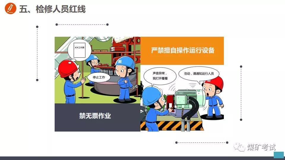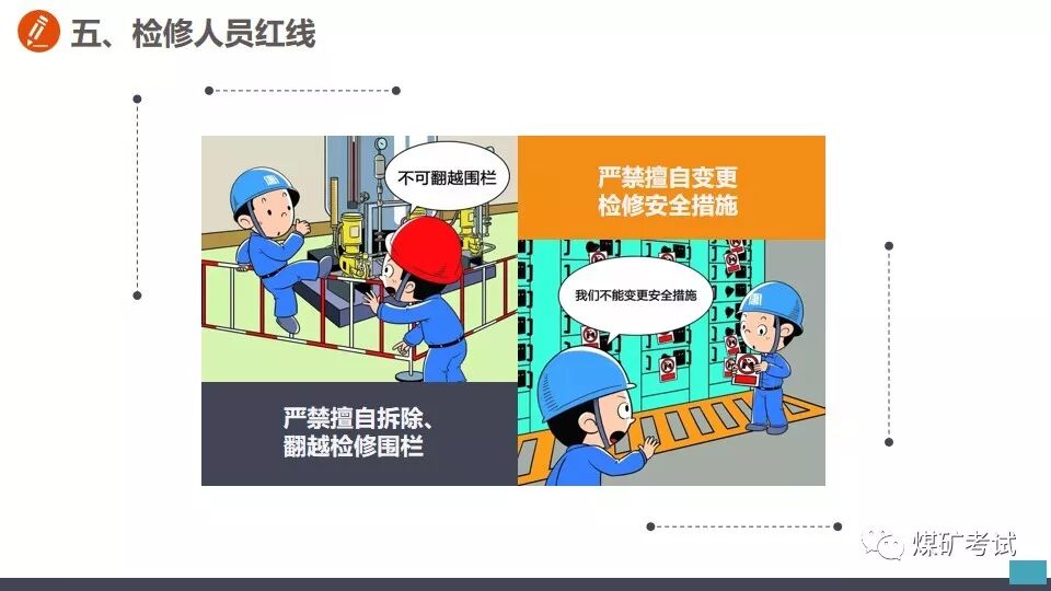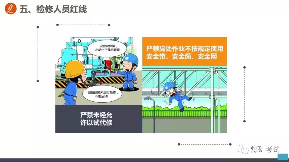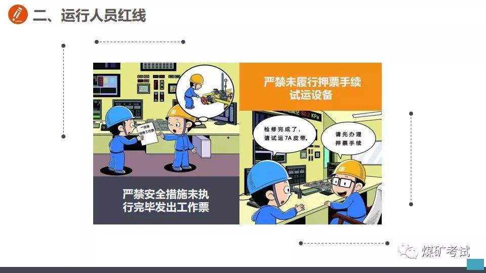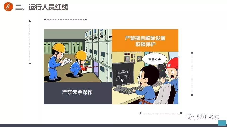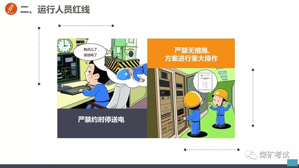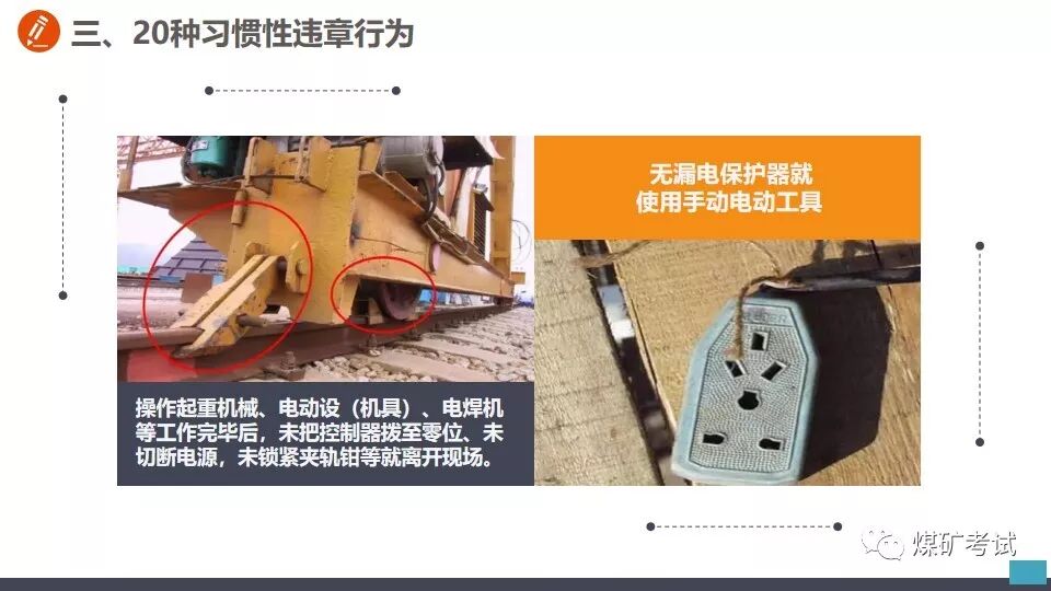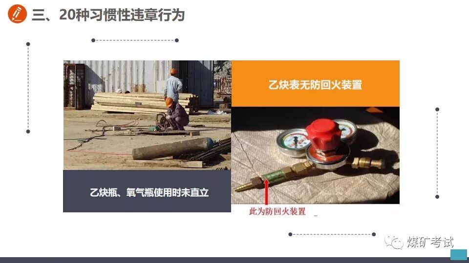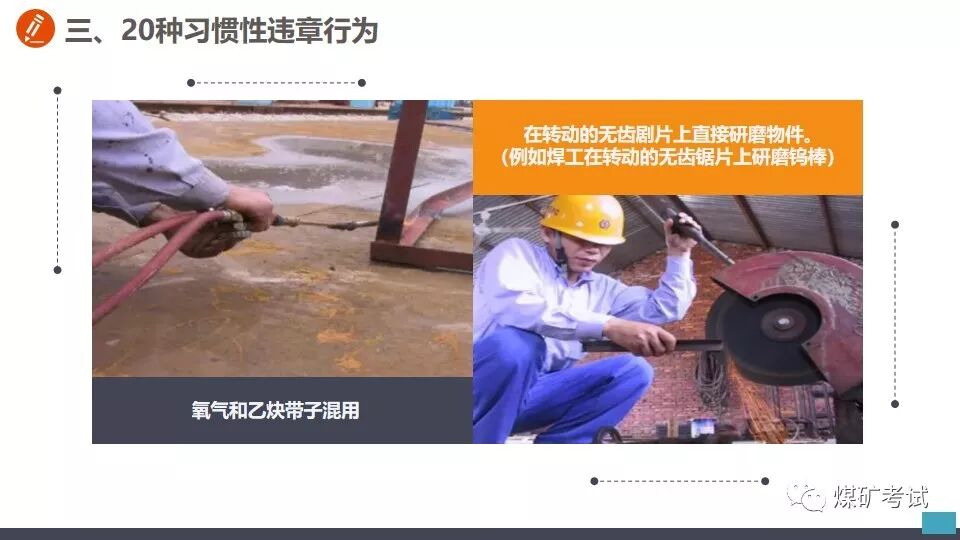 从事切割作业之前 不清理现场 【举例】 某钳工班工人到厂房内切割钢筋,未清理现场,掉落的铁屑和火花溅到附近的一堆木屑上,引起火灾。 【纠正方法】 应对职工加强危险意识教育,从事切割作业之前,应首先清理现场,清除作业环境中的不安全因素。对不清理现场即从事切割的工人,应立即劝阻停止工作并予以处罚。 在带电作业过程中设备突然停电时, 【举例】 在带电作业过程中设备突然停电时,有的工人便认为此时的设备已经无电,因而放弃防止触电的保护措施。这样做是十分危险的,如果突然恢复送电,或者设备因短路而部分停电,与设备接触就会发生触电事故。 【纠正方法】 在带电作业过程中,如果设备突然停电,必须视同设备带电,仍要按照带电作业的要求进行工作。对视为设备不带电的麻痹大意思想,应及时教育帮助并立即加以纠正。 带电水冲洗密封不良的设备 【举例】 在带电水冲洗时,有的工作人员不检查设备密封是否严密,一概用水冲洗,遇到密封不良的设备时,往往发生触电事故。 【纠正方法】 在带电水冲洗设备时,首先应对设备密封情况进行检查。密封良好的设备,可以带电水冲洗,密封不良的设备不得进行水冲洗。 在开挖的土方斜坡上放置物料 【举例】 挖掘电缆沟时,有的工作人员贪图方便,把工具材料等放在土方的斜坡上,有时工具材料滚落于沟内,既造成工作不便,而且容易砸伤人员。 【纠正方法】 应了解保持土方斜坡稳定的作用,杜绝在上面放置工具材料等。对在斜坡上放置工具材料的,应立即清除。 电器设备着火,使用泡沫灭火器灭火 【举例】 有的工作人员在电器设备着火时,慌乱之中,用泡沫灭火器灭火,结果适得其反,越喷火焰越大。 【纠正方法】 应让职工懂得灭火器的不同性能和用途。扑灭电器设备火灾,只能使用干式或二氧化碳灭火器,不得使用泡沫灭火器。泡沫灭火器只能用于扑救油类设备起火。电器设备起火时,应沉着冷静,选取干式或二氧化碳灭火器灭火。 危险作业不挂警示牌 【举例】 在给厂区浴池蒸汽管道加装堵饭时,一名工人关闭了汽门,却不挂警示牌。另一名工人接到厂里电话要求送汽,以为浴池里面无人就打开汽门。一股热气冲出,把那名正在作业的工人的脚烫伤。 【纠正方法】 从事危险作业之前,应悬挂警示牌或专人监护。加强安全监督检查,对危险作业不挂警示牌的,及时纠正并予以处罚。 起吊时超重吊装 【举例】 某起重班在组塔施工中,吊重为5.9t,超重吊载7.2t重物。当吊物接近就位时,左侧横担刮在曲臂上端主材和背铁上。横担一颤,随即下落,将抱杆上拉线和磨绳冲断。 【纠正方法】 在起吊作业中,严禁超载超重吊装,如发现超载超重吊装的现象,应立即纠正并严肃处理。 一定要谨记 严格按照安全生产规程正确操作 切勿违章作业! 附安全行为手册,人手一份!