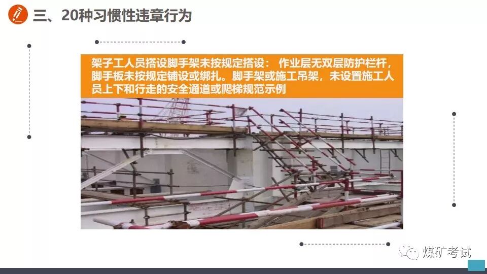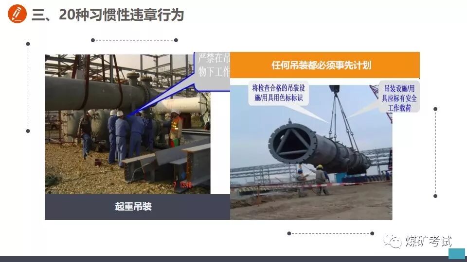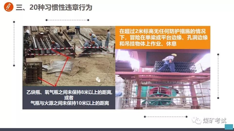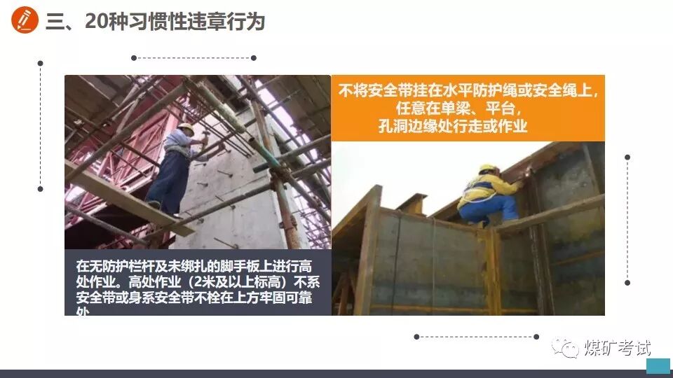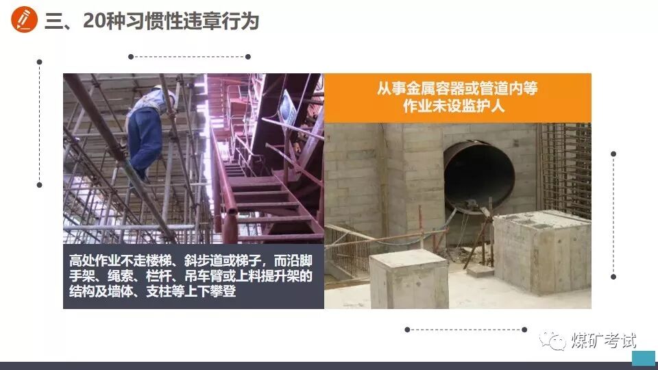 高处作业不系安全带 【举例】 某施工现场工人高处作业未系安全带,坠落后被钢筋刺穿! 高空作业不系安全带,直接坠落 再看看这个,幸好系了安全带! 【纠正方法】 加强危险意识教育,从事高处作业必须系好安全带! 天热不带安全帽 【举例】 看安全帽的救命案例 试想要是没有戴安全帽,脑袋直接被融掉! 钢板脱钩,直接打击头部,安全帽救命! 猝不及防,掉下来铁棍直接砸到工人头上! 打击伤害无处不在,不要存在侥幸! 【纠正方法】 加强危险意识教育,进入现场必须佩戴好安全帽! 进入受限空间不进行有毒气体检测 【举例】 7月22日16时30分许,河北张家口市怀来县长城生物化学工程有限公司在组织清理厂区污水沉淀池时,发生有害气体中毒事故。事故共造成5人死亡,4人受伤 【纠正方法】 1.必须严格实行作业审批制度,严禁擅自进入有限空间作业。 2.必须做到“先通风、再检测、后作业”,严禁通风、检测不合格作业。 3.必须配备个人防中毒窒息等防护装备,设置安全警示标识,严禁无防护监护措施作业。 4.必须对作业人员进行安全培训,严禁教育培训不合格上岗作业。 5.必须制定应急措施,现场配备应急装备,严禁盲目施救。 未关电、未按急停、未挂牌随意进入机械工作区域 【举例】 未关电、未按急停、未挂牌随意进入机械模腔里面;当你回头想出来,门都没有,这等于自杀。