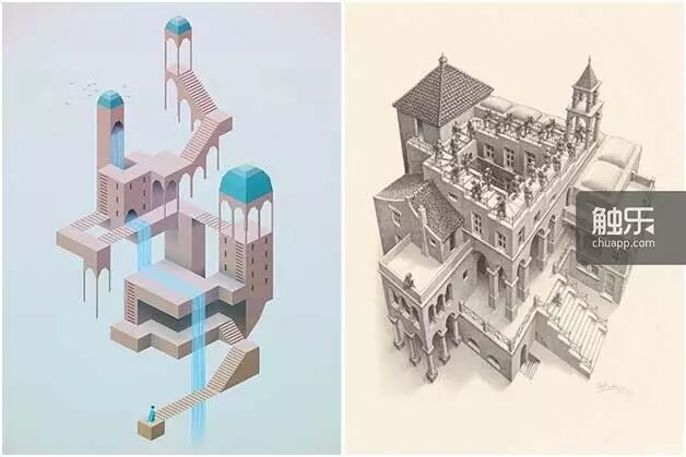 左:游戏主设计师王友健(Ken Wong)的游戏概念图,游戏最初名为《幻像之塔》;右:M•C•埃舍尔(M. C. Escher)的艺术作品,它在游戏的概念扩展过程中起到了关键作用(上升与下降,1960)