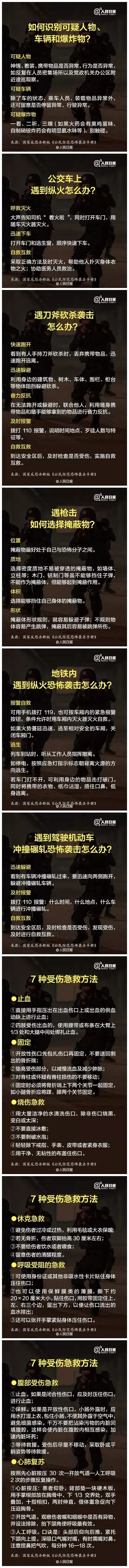 我们愿灾难不再,但我们都应了解基本的防恐常识。那么怎样识别可疑人物和爆炸物?遇到刀斧砍杀袭击如何躲避?公共汽车上遇到纵火恐怖袭击怎么逃生?遇到枪击如何选掩蔽物?人民日报来告诉你以下防恐知识。