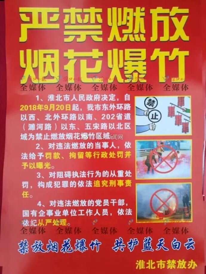 根据《淮北市烟花爆竹燃放管理办法》,今年春节、元宵节期间,淮北将对烟花爆竹储存、运输、销售、燃放等环节从严监管。在禁放区域、场所或时间燃放烟花爆竹的,由公安机关责令停止燃放,处一百元以上五百元以下罚款,并做到:一律查找到燃放人、一律依法传唤到派出所调查取证、一律依法依规处罚到位、一律查清购货源头。凡不听劝阻、阻碍执法、影响恶劣,构成违反治安管理行为的,依法予以治安管理处罚,并由新闻单位曝光。