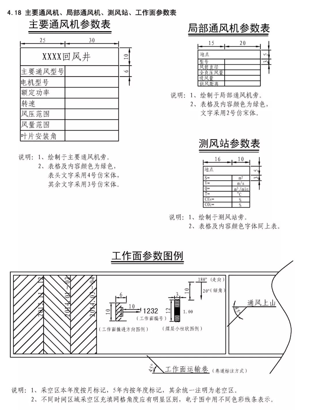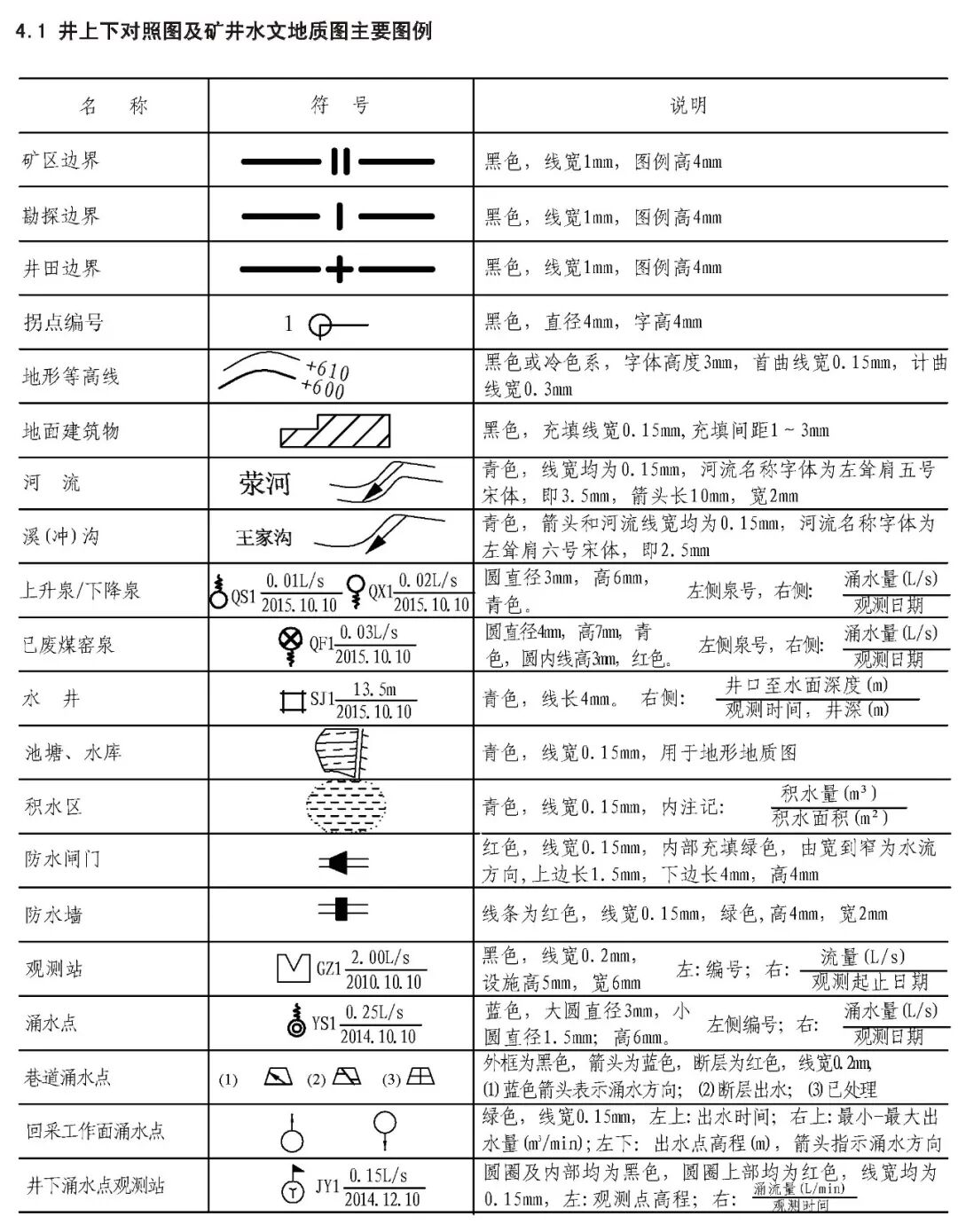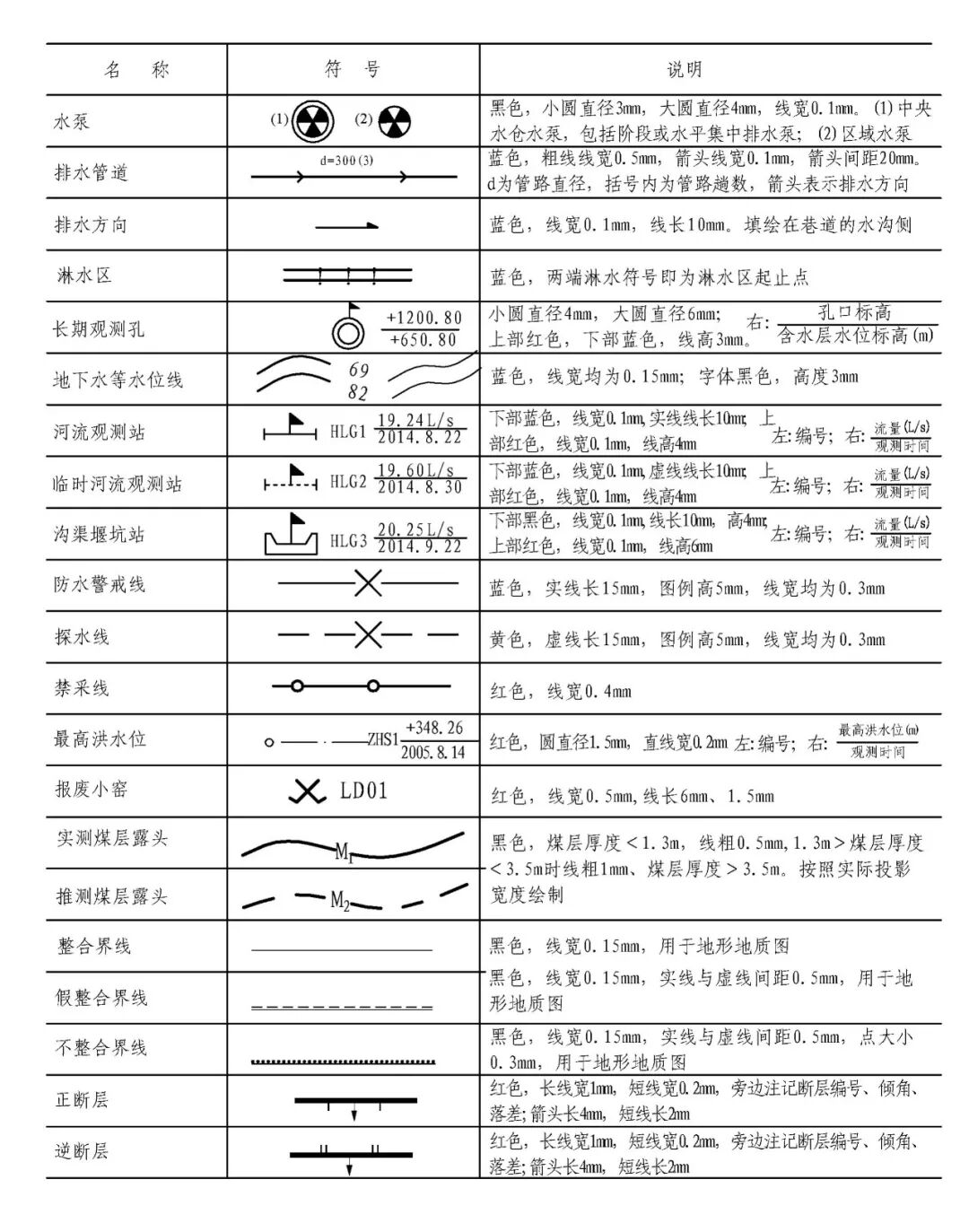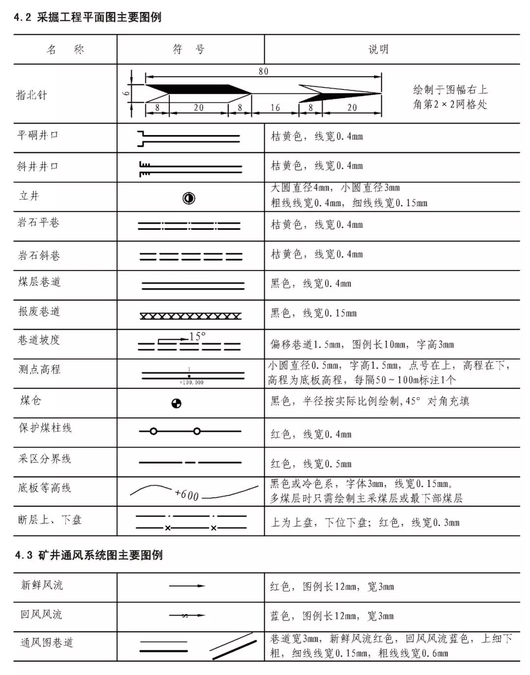 煤炭矿井主要矿图绘制基本要求 XXX设计研究院承编 二0一五年十一月 目 次 前言 III 1 范围 1 2 规范性引用文件 1 3 要求 2 3.1 基本要求 2 3.2 井上下对照图绘制基本要求 2 3.3 矿井水文地质图绘制基本要求 3 3.4 采掘工程平面图绘制基本要求 3 3.5 矿井通风系统图绘制基本要求 4 3.6 井下避灾路线图绘制基本要求 4 3.7 抽放瓦斯管路系统图绘制基本要求 4 3.8 井下传感器布置及安全监测系统图绘制基本要求 4 3.9 矿井通信联络系统图绘制基本要求 5 3.10 矿井人员定位系统图绘制基本要求 5 3.11 矿井安全监控系统断电控制图制基本要求 5 3.12 矿井供配电系统图绘制基本要求 5 3.13 井下电气设备布置图绘制基本要求 6 3.14 井下运输系统图绘制基本要求 6 3.15 压风自救系统图绘制基本要求 6 3.16 矿井排水系统示意图绘制基本要求 7 3.17 井下消防洒水及供水施救系统图绘制基本要求 7 4 主要图例及表格 8 4.1 井上井下对照图及水文地质图主要图例 8 4.2 采掘工程平面图主要图例 11 4.3 矿井通风系统图主要图例 11 4.4 井下避灾路线图主要图例 12 4.5 抽放瓦斯管路系统图主要图例 13 4.6 矿井安全监测监控装备图主要图例 13 4.7 矿井通信联络系统图主要图例 15 4.8 矿井人员定位系统图主要图例 15 4.9 井下运输系统图主要图例 15 4.10 压风自救系统图主要图例 17 4.11 矿井排水系统图主要图例 17 4.12 井下消防洒水及供水施救系统图主要图例 18 4.13 矿井井下供配电系统图主要图例 19 4.14 矿井地面供配电系统图主要图例 21 4.15 图例表格、图签、图框 22 4.16 图幅、矿区范围拐点坐标表 23 4.17 密闭、风门汇总表 24 4.18 主要通风机、局部通风机、测风站、工作面参数表 25 4.19 井下电气设备布置图参数表 26 4.20 井下运输系统图参数表 27 根据安监总煤调《国家安全监管总局国家煤矿安监局关于进一步加强和规范煤矿图纸管理和监管监察工作的通知》(〔2014〕80号)要求,为了进一步规范我省煤炭矿井图纸管理,达到矿井图纸测绘及时、填绘准确、标注完善、管理规范的要求,为日常监管及抢险救灾工作提供规范、可靠的图纸资料,特编制《煤炭矿井主要矿图绘制基本要求》。 本要求在编制过程中,编制组进行了广泛的调研工作,认真总结了我省煤炭矿井主要矿图绘制过程中的经验,并借鉴了相关规范、标准,广泛征求了监管、设计、科研、高等院校、生产单位等多方面意见,经多次讨论、反复修改,最后经审查定稿。在此对相关领导、专家及技术人员一并感谢。 本要求未涉及的内容,国家法律、法规和标准有规定的,执行国家法律、法规和标准。 编制单位:国家安全生产监督管理总局 国家煤矿安全监察局 承办单位:XXX煤炭设计研究院 煤炭矿井主要矿图绘制基本要求 本要求规定了煤炭矿井主要矿图绘制的基本要求。 本要求适用于井工开采煤矿主要矿图的绘制,井工开采的非煤矿山可参照执行。 下列文件对于本要求的应用是必不可少的。凡是注日期的引用文件,仅注日期的版本适用于本文件。凡是不注日期的引用文件,其最新版本(包括所有的修改单)适用于本文件。 GB/T 50593-2010 《煤炭矿井制图标准》 GB/T 18135-2008 《电气工程CAD制图规则》 GB 6988-2008 《电气制图标准》 GB 4728-2005 《电气图形符号国家标准》; GB/T 50518-2010 《矿井通风安全装备标准》; GB/T 50581-2010 《煤炭工业矿井监测监控系统装备配置标准》; GB 50471-2008 《煤矿瓦斯抽采工程设计规范》; GB/T 14479-1993 《传感器图用图形符号》 GB 50451-2008 《煤矿井下排水站及排水管路设计规范》 GB/T 50106-2010 《煤矿机械技术文件图形符号》 GB 50029-2014 《空气压缩机站设计规范》 GB/T 50106-2010 《给排水制图标准》 AQ 6201-2006 《煤矿安全监控系统通用技术要求》 AQ 1048-2007 《煤矿井下作业人员管理系统使用与管理规范》 AQ 6210-2007 《煤矿井下作业人员管理系统通用技术条件》 DB 51/T1412-2011 《煤矿井下人员定位系统安全技术规范》 MT/T 570-1996 《煤矿电气图专用图形符号》 《煤矿地质测量图例》煤炭工业出版社 《采矿工程设计手册》煤炭工业出版社 《煤矿安全规程》2011版(国家安全生产监督管理总局第37号令) 3.1.1 矿图必须做到准确、齐全、及时,符号运用正确、统 一,图纸内容布置适当,根据实际变化及时填绘和标注。 3.1.2 图纸中必须有图框线、图签、图例等主要要素;图签栏内容须齐全,必须有业主或矿长及主要技术负责人的亲笔签字,并加盖本单位公章。 3.1.3矿图按准确、及时、完整、美观的原则进行绘制。达到线条均匀、圆滑,接头间无疙瘩,点线、虚线间隔大小一致,平行线间距相等,各种文字、数字注记规范,字隔、字向符合要求,内容齐全、完整、几何关系正确。计算机制图过程中图中不同要素应采用不同色彩进行区分。 3.1.4 井上下对照图及水文地质图比例要求原则为1:2000或1:5000,采掘工程平面图比例要求原则为1:2000。图纸资料至少能反映矿井及周边100m范围内的真实情况,首、计曲线及高程等注记必须与图纸比例相适应。井上下对照图及采掘工程平面图图中标示的采、掘工程必须能反映矿井正常生产期间至少3个月内的工程进展真实情况,如实填绘井巷位置及采掘进度。图纸中必须标注指北针。 3.1.5 高程精度要求:巷道底板高程和地面控制点高程精度取0.001m;井口、井底、钻孔孔口、采高、见煤高程及煤厚精度取0.01m,断层落