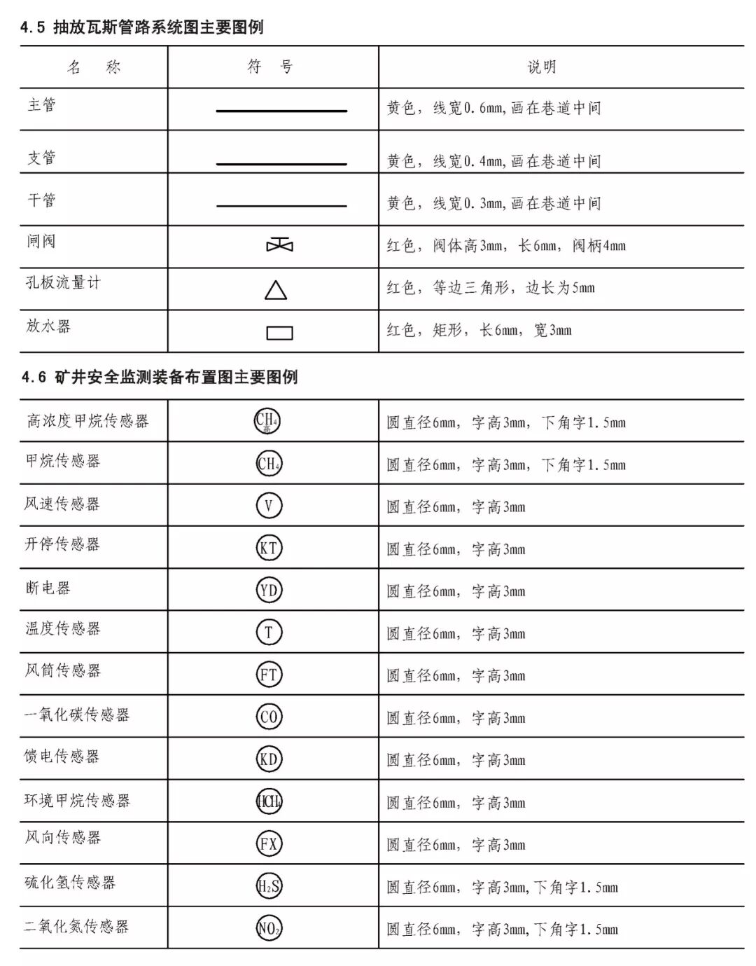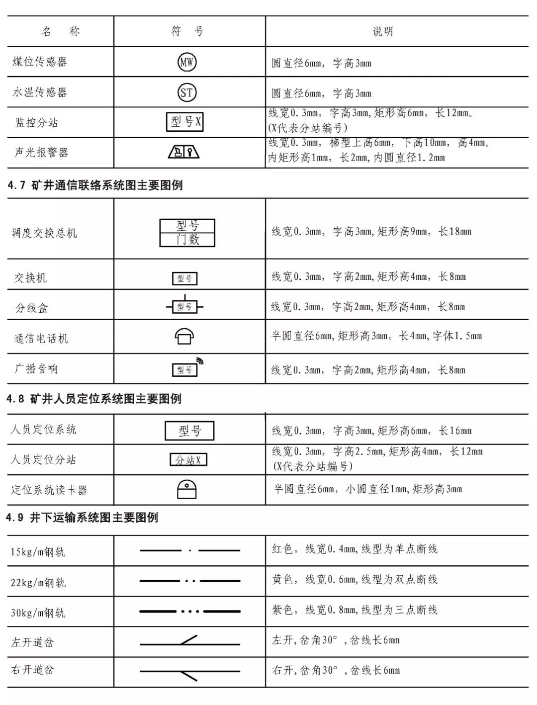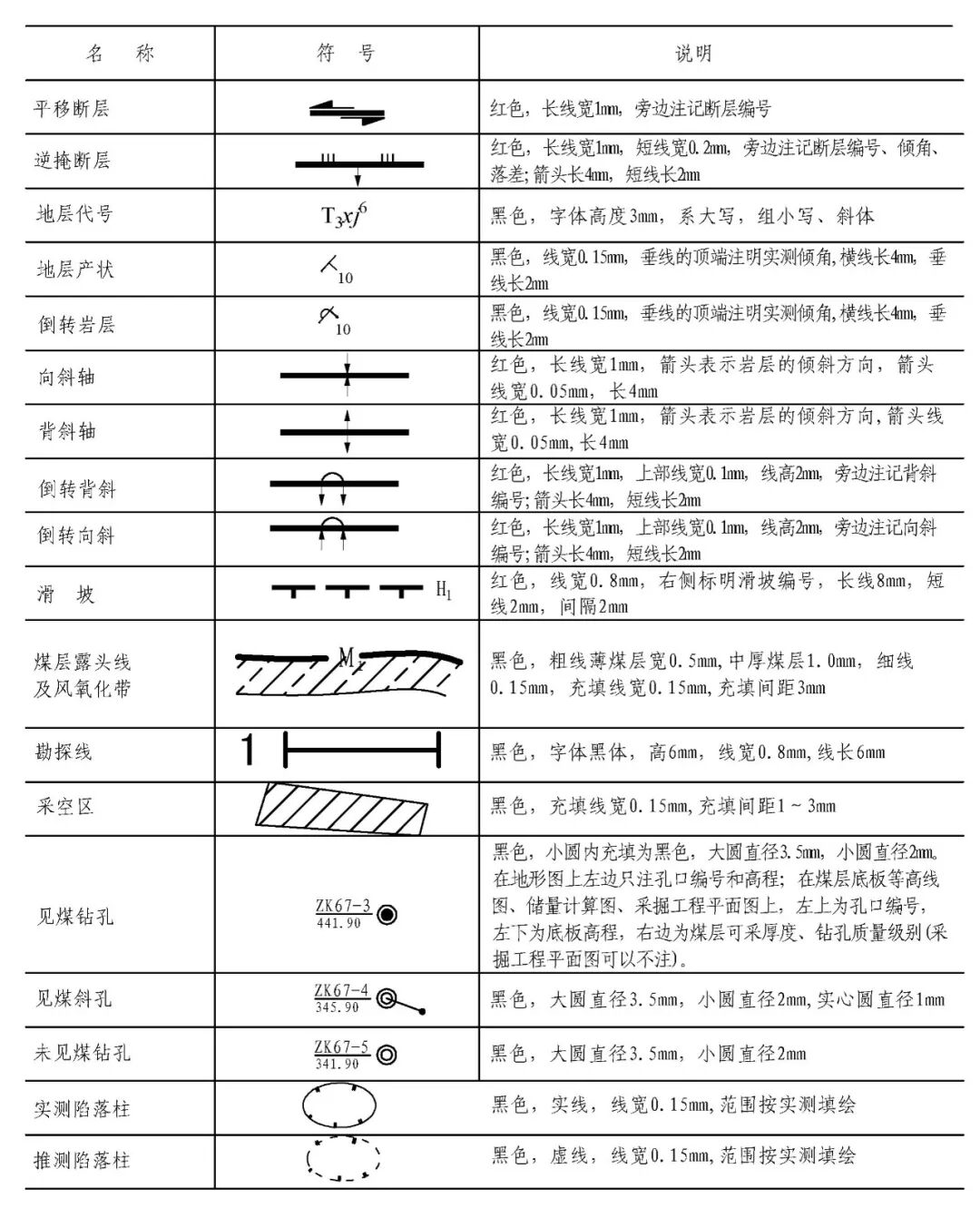 煤炭矿井主要矿图绘制基本要求 XXX设计研究院承编 二0一五年十一月 目 次 前言 III 1 范围 1 2 规范性引用文件 1 3 要求 2 3.1 基本要求 2 3.2 井上下对照图绘制基本要求 2 3.3 矿井水文地质图绘制基本要求 3 3.4 采掘工程平面图绘制基本要求 3 3.5 矿井通风系统图绘制基本要求 4 3.6 井下避灾路线图绘制基本要求 4 3.7 抽放瓦斯管路系统图绘制基本要求 4 3.8 井下传感器布置及安全监测系统图绘制基本要求 4 3.9 矿井通信联络系统图绘制基本要求 5 3.10 矿井人员定位系统图绘制基本要求 5 3.11 矿井安全监控系统断电控制图制基本要求 5 3.12 矿井供配电系统图绘制基本要求 5 3.13 井下电气设备布置图绘制基本要求 6 3.14 井下运输系统图绘制基本要求 6 3.15 压风自救系统图绘制基本要求 6 3.16 矿井排水系统示意图绘制基本要求 7 3.17 井下消防洒水及供水施救系统图绘制基本要求 7 4 主要图例及表格 8 4.1 井上井下对照图及水文地质图主要图例 8 4.2 采掘工程平面图主要图例 11 4.3 矿井通风系统图主要图例 11 4.4 井下避灾路线图主要图例 12 4.5 抽放瓦斯管路系统图主要图例 13 4.6 矿井安全监测监控装备图主要图例 13 4.7 矿井通信联络系统图主要图例 15 4.8 矿井人员定位系统图主要图例 15 4.9 井下运输系统图主要图例 15 4.10 压风自救系统图主要图例 17 4.11 矿井排水系统图主要图例 17 4.12 井下消防洒水及供水施救系统图主要图例 18 4.13 矿井井下供配电系统图主要图例 19 4.14 矿井地面供配电系统图主要图例 21 4.15 图例表格、图签、图框 22 4.16 图幅、矿区范围拐点坐标表 23 4.17 密闭、风门汇总表 24 4.18 主要通风机、局部通风机、测风站、工作面参数表 25 4.19 井下电气设备布置图参数表 26 4.20 井下运输系统图参数表 27 根据安监总煤调《国家安全监管总局国家煤矿安监局关于进一步加强和规范煤矿图纸管理和监管监察工作的通知》(〔2014〕80号)要求,为了进一步规范我省煤炭矿井图纸管理,达到矿井图纸测绘及时、填绘准确、标注完善、管理规范的要求,为日常监管及抢险救灾工作提供规范、可靠的图纸资料,特编制《煤炭矿井主要矿图绘制基本要求》。 本要求在编制过程中,编制组进行了广泛的调研工作,认真总结了我省煤炭矿井主要矿图绘制过程中的经验,并借鉴了相关规范、标准,广泛征求了监管、设计、科研、高等院校、生产单位等多方面意见,经多次讨论、反复修改,最后经审查定稿。在此对相关领导、专家及技术人员一并感谢。 本要求未涉及的内容,国家法律、法规和标准有规定的,执行国家法律、法规和标准。 编制单位:国家安全生产监督管理总局 国家煤矿安全监察局 承办单位:XXX煤炭设计研究院 煤炭矿井主要矿图绘制基本要求 本要求规定了煤炭矿井主要矿图绘制的基本要求。 本要求适用于井工开采煤矿主要矿图的绘制,井工开采的非煤矿山可参照执行。 下列文件对于本要求的应用是必不可少的。凡是注日期的引用文件,仅注日期的版本适用于本文件。凡是不注日期的引用文件,其最新版本(包括所有的修改单)适用于本文件。 GB/T 50593-2010 《煤炭矿井制图标准》 GB/T 18135-2008 《电气工程CAD制图规则》 GB 6988-2008 《电气制图标准》 GB 4728-2005 《电气图形符号国家标准》; GB/T 50518-2010 《矿井通风安全装备标准》; GB/T 50581-2010 《煤炭工业矿井监测监控系统装备配置标准》; GB 50471-2008 《煤矿瓦斯抽采工程设计规范》; GB/T 14479-1993 《传感器图用图形符号》 GB 50451-2008 《煤矿井下排水站及排水管路设计规范》 GB/T 50106-2010 《煤矿机械技术文件图形符号》 GB 50029-2014 《空气压缩机站设计规范》 GB/T 50106-2010 《给排水制图标准》 AQ 6201-2006 《煤矿安全监控系统通用技术要求》 AQ 1048-2007 《煤矿井下作业人员管理系统使用与管理规范》 AQ 6210-2007 《煤矿井下作业人员管理系统通用技术条件》 DB 51/T1412-2011 《煤矿井下人员定位系统安全技术规范》 MT/T 570-1996 《煤矿电气图专用图形符号》 《煤矿地质测量图例》煤炭工业出版社 《采矿工程设计手册》煤炭工业出版社 《煤矿安全规程》2011版(国家安全生产监督管理总局第37号令) 3.1.1 矿图必须做到准确、齐全、及时,符号运用正确、统 一,图纸内容布置适当,根据实际变化及时填绘和标注。 3.1.2 图纸中必须有图框线、图签、图例等主要要素;图签栏内容须齐全,必须有业主或矿长及主要技术负责人的亲笔签字,并加盖本单位公章。 3.1.3矿图按准确、及时、完整、美观的原则进行绘制。达到线条均匀、圆滑,接头间无疙瘩,点线、虚线间隔大小一致,平行线间距相等,各种文字、数字注记规范,字隔、字向符合要求,内容齐全、完整、几何关系正确。计算机制图过程中图中不同要素应采用不同色彩进行区分。 3.1.4 井上下对照图及水文地质图比例要求原则为1:2000或1:5000,采掘工程平面图比例要求原则为1:2000。图纸资料至少能反映矿井及周边100m范围内的真实情况,首、计曲线及高程等注记必须与图纸比例相适应。井上下对照图及采掘工程平面图图中标示的采、掘工程必须能反映矿井正常生产期间至少3个月内的工程进展真实情况,如实填绘井巷位置及采掘进度。图纸中必须标注指北针。 3.1.5 高程精度要求:巷道底板高程和地面控制点高程精度取0.001m;井口、井底、钻孔孔口、采高、见煤高程及煤厚精度取0.01m,断层落