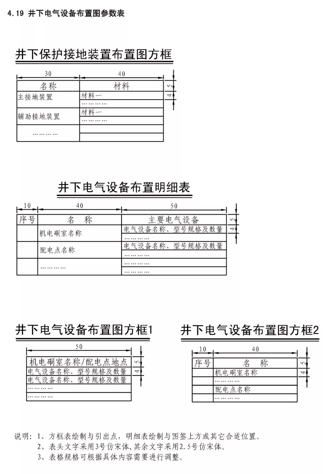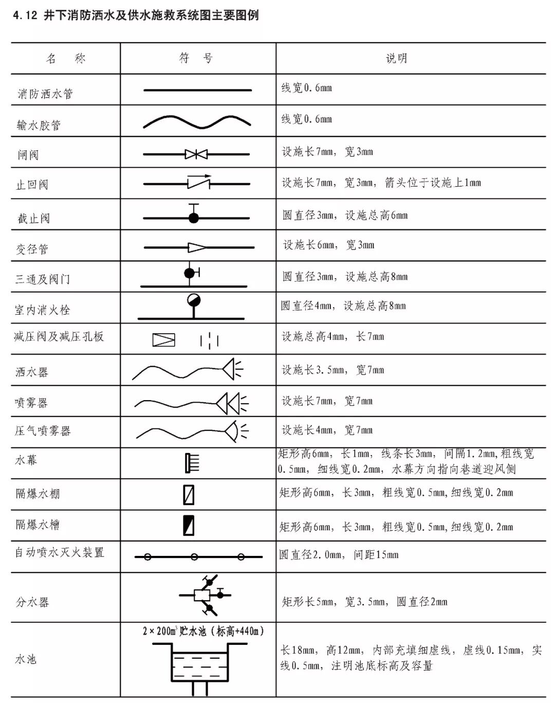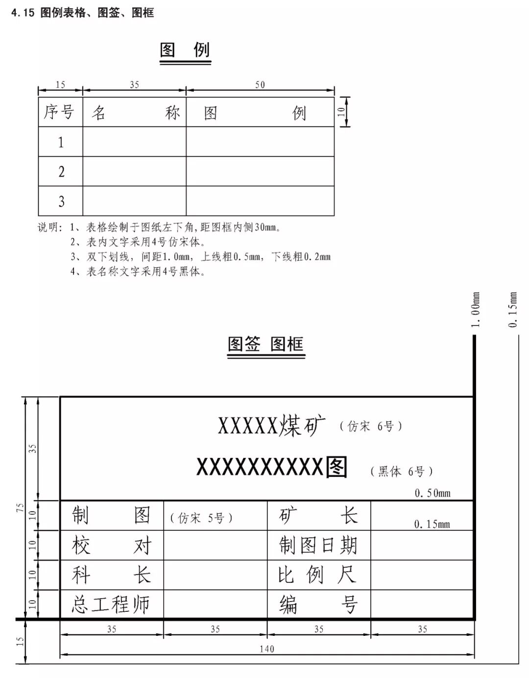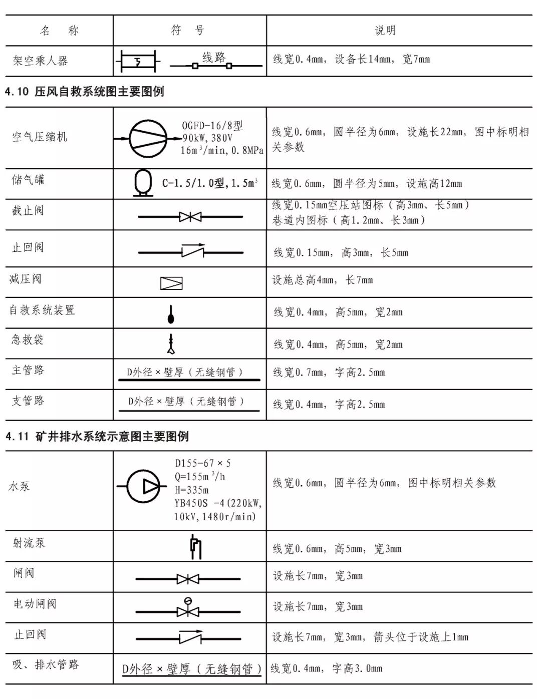 煤炭矿井主要矿图绘制基本要求 XXX设计研究院承编 二0一五年十一月 目 次 前言 III 1 范围 1 2 规范性引用文件 1 3 要求 2 3.1 基本要求 2 3.2 井上下对照图绘制基本要求 2 3.3 矿井水文地质图绘制基本要求 3 3.4 采掘工程平面图绘制基本要求 3 3.5 矿井通风系统图绘制基本要求 4 3.6 井下避灾路线图绘制基本要求 4 3.7 抽放瓦斯管路系统图绘制基本要求 4 3.8 井下传感器布置及安全监测系统图绘制基本要求 4 3.9 矿井通信联络系统图绘制基本要求 5 3.10 矿井人员定位系统图绘制基本要求 5 3.11 矿井安全监控系统断电控制图制基本要求 5 3.12 矿井供配电系统图绘制基本要求 5 3.13 井下电气设备布置图绘制基本要求 6 3.14 井下运输系统图绘制基本要求 6 3.15 压风自救系统图绘制基本要求 6 3.16 矿井排水系统示意图绘制基本要求 7 3.17 井下消防洒水及供水施救系统图绘制基本要求 7 4 主要图例及表格 8 4.1 井上井下对照图及水文地质图主要图例 8 4.2 采掘工程平面图主要图例 11 4.3 矿井通风系统图主要图例 11 4.4 井下避灾路线图主要图例 12 4.5 抽放瓦斯管路系统图主要图例 13 4.6 矿井安全监测监控装备图主要图例 13 4.7 矿井通信联络系统图主要图例 15 4.8 矿井人员定位系统图主要图例 15 4.9 井下运输系统图主要图例 15 4.10 压风自救系统图主要图例 17 4.11 矿井排水系统图主要图例 17 4.12 井下消防洒水及供水施救系统图主要图例 18 4.13 矿井井下供配电系统图主要图例 19 4.14 矿井地面供配电系统图主要图例 21 4.15 图例表格、图签、图框 22 4.16 图幅、矿区范围拐点坐标表 23 4.17 密闭、风门汇总表 24 4.18 主要通风机、局部通风机、测风站、工作面参数表 25 4.19 井下电气设备布置图参数表 26 4.20 井下运输系统图参数表 27 根据安监总煤调《国家安全监管总局国家煤矿安监局关于进一步加强和规范煤矿图纸管理和监管监察工作的通知》(〔2014〕80号)要求,为了进一步规范我省煤炭矿井图纸管理,达到矿井图纸测绘及时、填绘准确、标注完善、管理规范的要求,为日常监管及抢险救灾工作提供规范、可靠的图纸资料,特编制《煤炭矿井主要矿图绘制基本要求》。 本要求在编制过程中,编制组进行了广泛的调研工作,认真总结了我省煤炭矿井主要矿图绘制过程中的经验,并借鉴了相关规范、标准,广泛征求了监管、设计、科研、高等院校、生产单位等多方面意见,经多次讨论、反复修改,最后经审查定稿。在此对相关领导、专家及技术人员一并感谢。 本要求未涉及的内容,国家法律、法规和标准有规定的,执行国家法律、法规和标准。 编制单位:国家安全生产监督管理总局 国家煤矿安全监察局 承办单位:XXX煤炭设计研究院 煤炭矿井主要矿图绘制基本要求 本要求规定了煤炭矿井主要矿图绘制的基本要求。 本要求适用于井工开采煤矿主要矿图的绘制,井工开采的非煤矿山可参照执行。 下列文件对于本要求的应用是必不可少的。凡是注日期的引用文件,仅注日期的版本适用于本文件。凡是不注日期的引用文件,其最新版本(包括所有的修改单)适用于本文件。 GB/T 50593-2010 《煤炭矿井制图标准》 GB/T 18135-2008 《电气工程CAD制图规则》 GB 6988-2008 《电气制图标准》 GB 4728-2005 《电气图形符号国家标准》; GB/T 50518-2010 《矿井通风安全装备标准》; GB/T 50581-2010 《煤炭工业矿井监测监控系统装备配置标准》; GB 50471-2008 《煤矿瓦斯抽采工程设计规范》; GB/T 14479-1993 《传感器图用图形符号》 GB 50451-2008 《煤矿井下排水站及排水管路设计规范》 GB/T 50106-2010 《煤矿机械技术文件图形符号》 GB 50029-2014 《空气压缩机站设计规范》 GB/T 50106-2010 《给排水制图标准》 AQ 6201-2006 《煤矿安全监控系统通用技术要求》 AQ 1048-2007 《煤矿井下作业人员管理系统使用与管理规范》 AQ 6210-2007 《煤矿井下作业人员管理系统通用技术条件》 DB 51/T1412-2011 《煤矿井下人员定位系统安全技术规范》 MT/T 570-1996 《煤矿电气图专用图形符号》 《煤矿地质测量图例》煤炭工业出版社 《采矿工程设计手册》煤炭工业出版社 《煤矿安全规程》2011版(国家安全生产监督管理总局第37号令) 3.1.1 矿图必须做到准确、齐全、及时,符号运用正确、统 一,图纸内容布置适当,根据实际变化及时填绘和标注。 3.1.2 图纸中必须有图框线、图签、图例等主要要素;图签栏内容须齐全,必须有业主或矿长及主要技术负责人的亲笔签字,并加盖本单位公章。 3.1.3矿图按准确、及时、完整、美观的原则进行绘制。达到线条均匀、圆滑,接头间无疙瘩,点线、虚线间隔大小一致,平行线间距相等,各种文字、数字注记规范,字隔、字向符合要求,内容齐全、完整、几何关系正确。计算机制图过程中图中不同要素应采用不同色彩进行区分。 3.1.4 井上下对照图及水文地质图比例要求原则为1:2000或1:5000,采掘工程平面图比例要求原则为1:2000。图纸资料至少能反映矿井及周边100m范围内的真实情况,首、计曲线及高程等注记必须与图纸比例相适应。井上下对照图及采掘工程平面图图中标示的采、掘工程必须能反映矿井正常生产期间至少3个月内的工程进展真实情况,如实填绘井巷位置及采掘进度。图纸中必须标注指北针。 3.1.5 高程精度要求:巷道底板高程和地面控制点高程精度取0.001m;井口、井底、钻孔孔口、采高、见煤高程及煤厚精度取0.01m,断层落